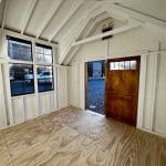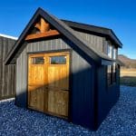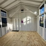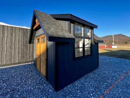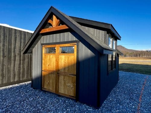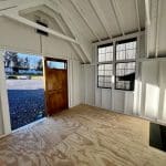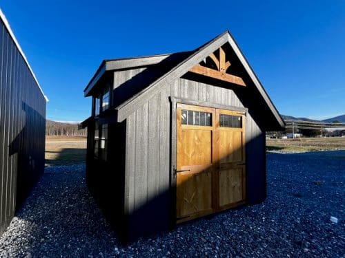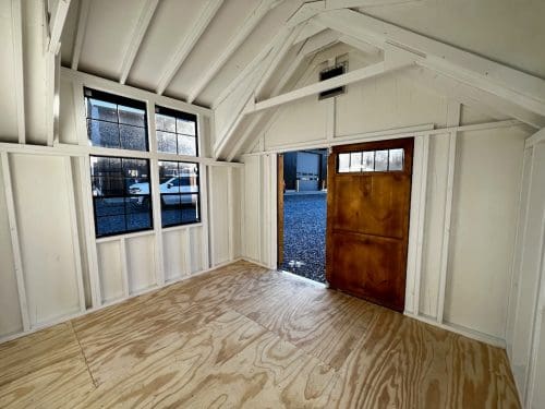 Features: 6′ Sidewalls, (4) 24″ x 36″ Black Windows, Transom Windows in Door, Pressure Treated Runners, (2) Victorian Vents, Double Farmhouse Dormer, Diamond Plate Threshold, Paint Interior White, Timber Frame Straight Accent Truss, and a 6′ Double Door