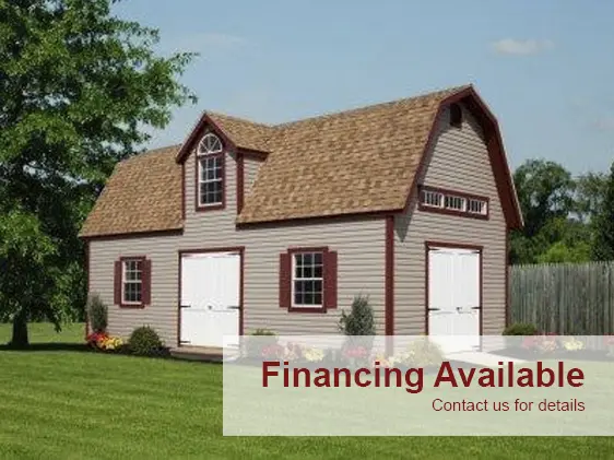 Our Two-Story Royal Victorian Dutch Barn Garage comes in a variety of sizes and styles. It can provide you with the studio space you have been dreaming of, the garage your vehicles need, the storage solution long ignored or a guest suite for all of your friends and family. Standard Two-Story Royal Victorian Dutch Barns include 9' side walls, a pressure treated floor, four 24" x 36" windows with shutters, one set of 6' double doors, stairs to the full upstairs loft and two Victorian style vents. Just add the garage style and size door you want! This model arrives with a completed bottom half, the roof is assembled on site by our crew. We also have a complete package available including: Lot clearing, installation of the foundation, water, sewer, and power to make this a permanent residence.Finance for as little as $173.00 per month!