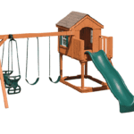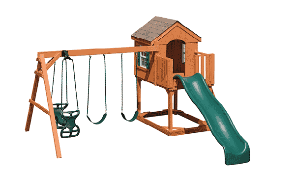 Shown with: 4'x6' Playhouse with porch, entrance ladder, sandbox, 10'scoop slide, two working widows with shutters. The attached aframe with beam features two sling swings and a plastic glider. Finance for as little as $53.00 per month!