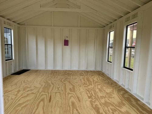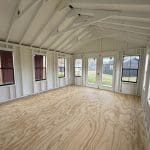 Features: 6′ Double Door with Full Glass Insert, 7′ Sidewalls, Pressure Treated Runners, Pressure Treated Floor Joists, (8) 24″ x 48″ Windows, Painted Interior, Soffit Vents, Ridge Vent, Add 3’6″ Porch