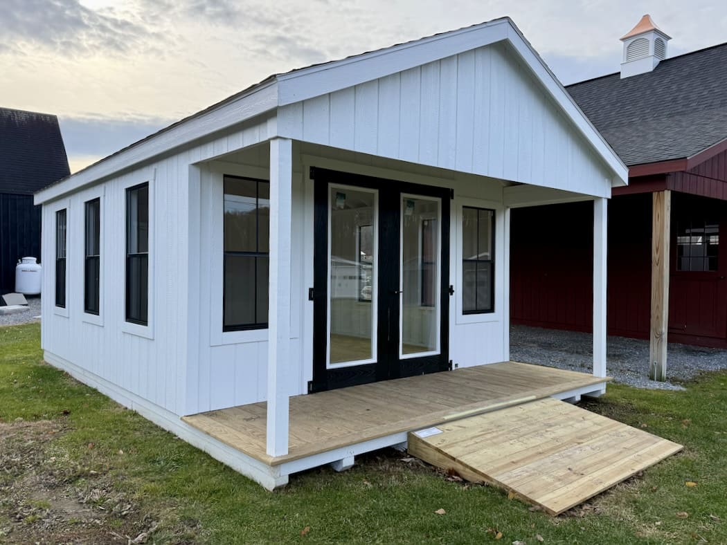 Features: 6′ Double Door with Full Glass Insert, 7′ Sidewalls, Pressure Treated Runners, Pressure Treated Floor Joists, (8) 24″ x 48″ Windows, Painted Interior, Soffit Vents, Ridge Vent, Add 3’6″ Porch