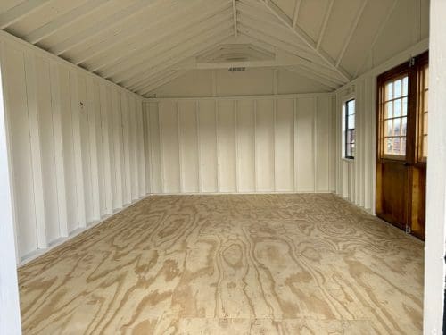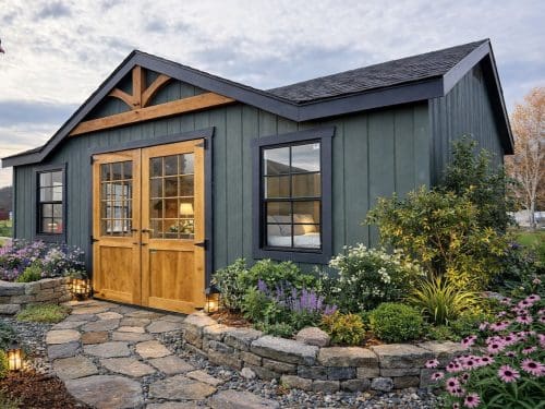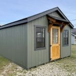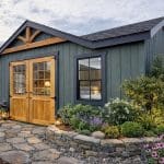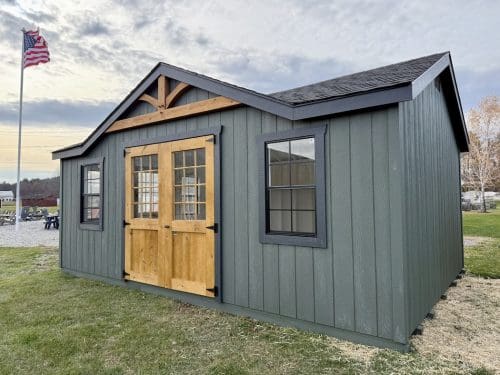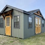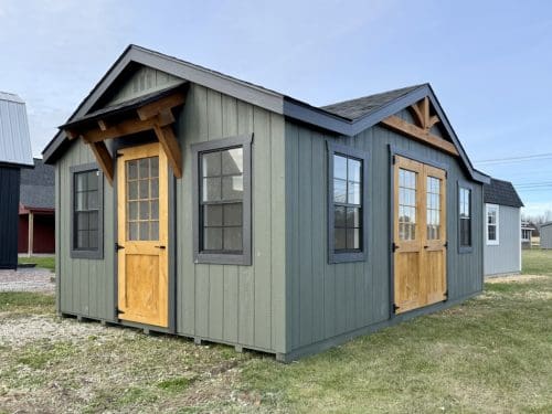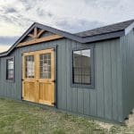 Features: (4) 24″ x 40″ Black Windows, 7′ Sidewalls, Pressure Treated Floor Joists/Runners, (2) Gable Vents, 6′ Stained Double Door with Sash Windows, 3′ Single Door with Sash Windows, Diamond Plate Thresholds, Paint Interior White, 4′ Eyebrow Roof Accent, Peak Dormer and Straight Timber Frame Accent