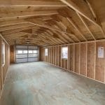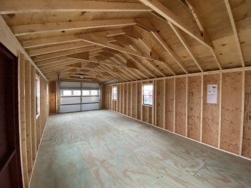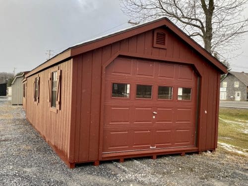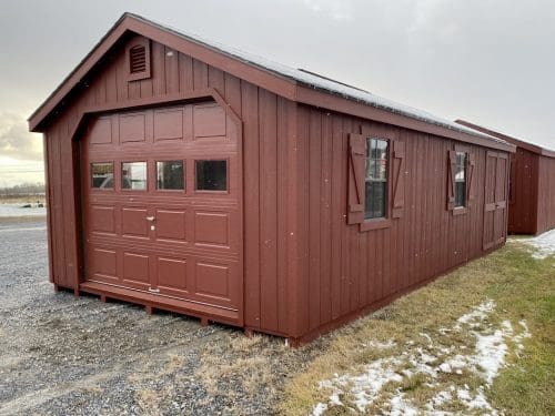 Features: (4) 24″ x 36″ windows, 7′ Sidewalls, Pressure Treated Floor, (2) Gable Vents, 9′ x 7′ Garage Door, 6′ Double Door, and Ridge Vent