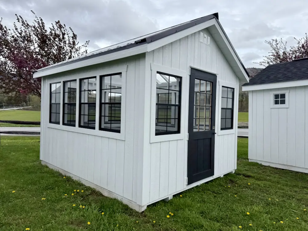 Features: (13) Black 24″ x 36″ Windows, 3′ Single Door, Sash Window in Door, 7′ Sidewalls, Trex Flooring, (2.5) 2′ x 12′ Plastic Grid Workbenches, Painted Interior Walls and Ceiling Painted, and Gable Vents