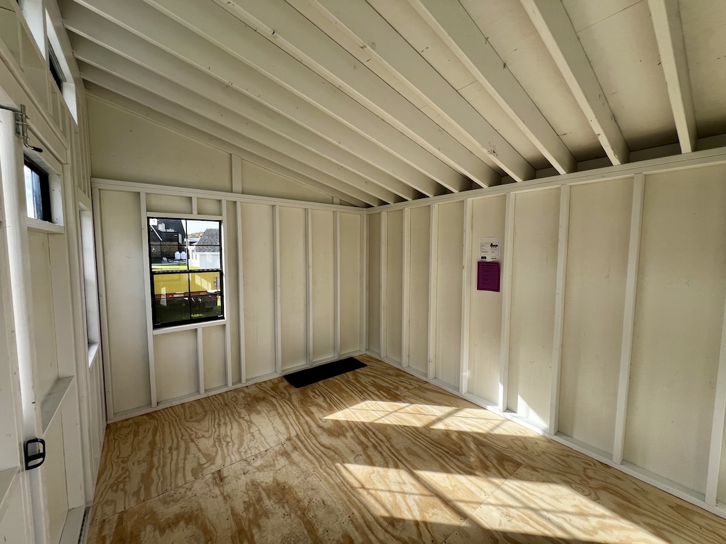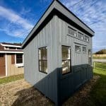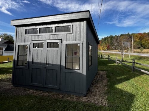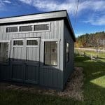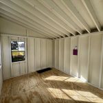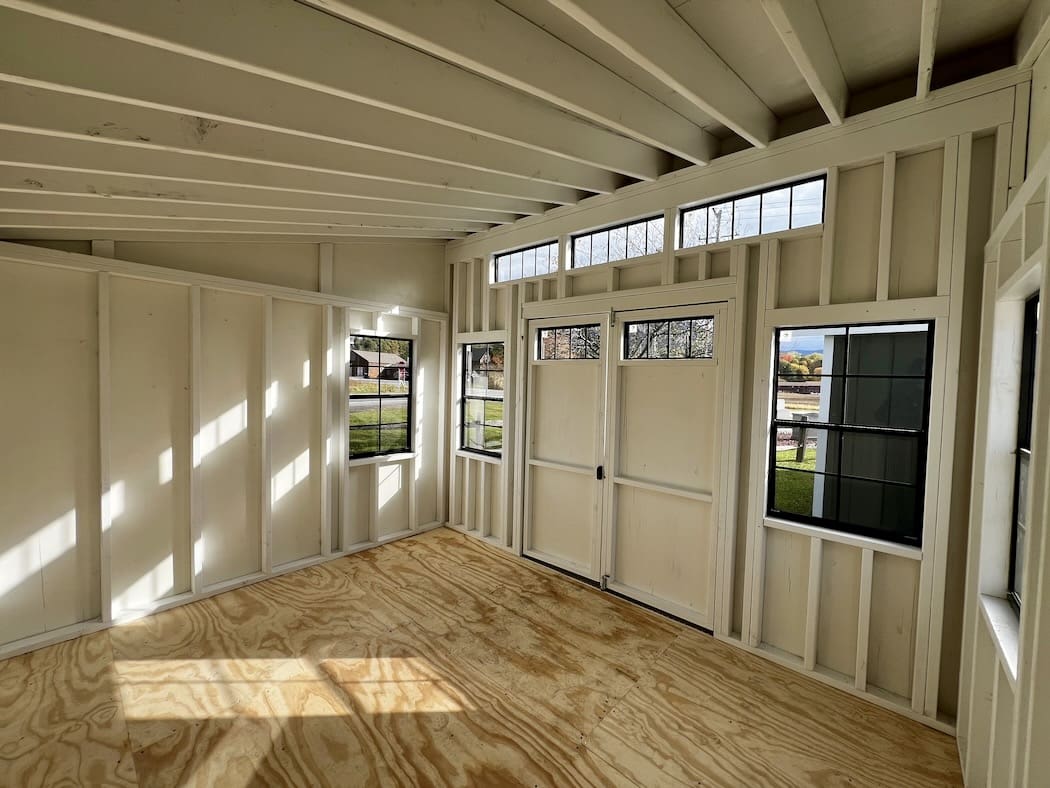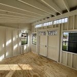 Features: (4) 24″ x 40″ Windows, 5′ Double Door With Transom Windows, Interior Painted White, Diamond Plate Threshold, Transom Windows, Pressure Treated Runners and Floor Joists and Soffit Vents