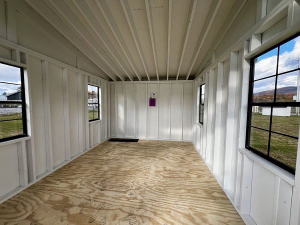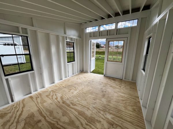 Features: (4) 24″ x 40″ Windows, 6′ Double Door With Sash Windows, Interior Painted White, Diamond Plate Threshold, Transom Windows, Pressure Treated Runners and Floor Joists and Soffit Vents