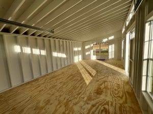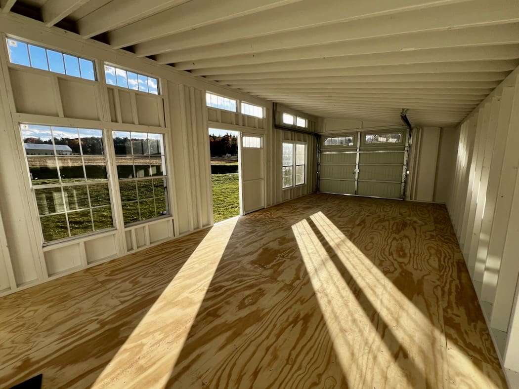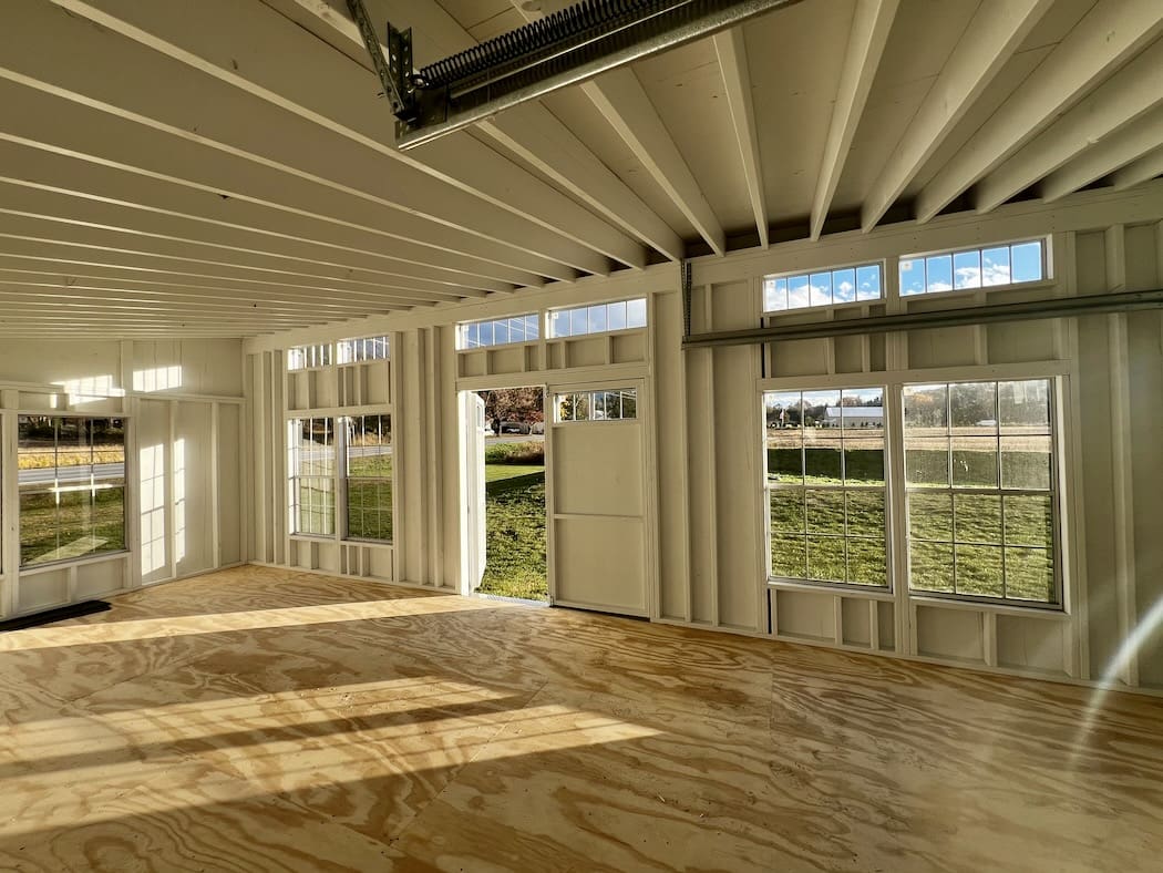 Features: (6) 30″ x 54″ windows, Soffit Vents, Pressure Treated Floor Joists & Runners, Transom Windows, 6′ Double Door, White Interior Paint, 9′ x 7′ Carriage Garage Door, Diamond Plate Thresholds and upgraded Floor Joists to 12″ OC
