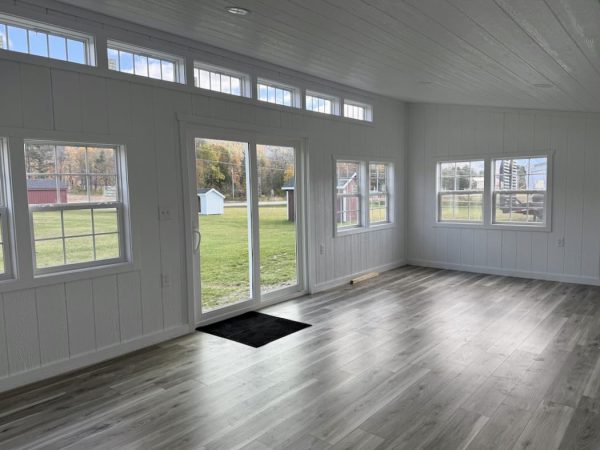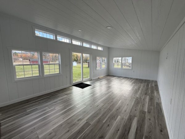 Features: 4″ x 4″ PT Runners, 2″ x 4″ PT Floor Joists, 2″ Spray Foam Insulation in Floor, Luxury Vinyl Flooring, 2″ x 4″ Wall Studs 16″ on Center, Insulated Walls and Ceiling, Wood Panel Interior, Interior Painted White, Insulated Transom Windows, Deluxe Electrical Package, Sliding Glass Door, (6) 30″ x 40″ Windows, and Additional Electrical Components