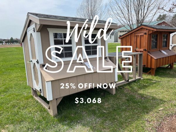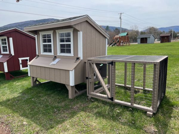 Features: Six Nesting Boxes, Access Door, Window, Lift Top Hatch For Boxes, Chicken Door with ramp, Pressure Treated Floor, Legs and Runners, Epoxy Floor and 4′ x 5′ Run. Fits 12-15 Chickens. Located at our 40 South Route 116 and Route 17 intersection in Bristol, VT.