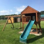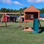 Shown with 6’x7′ playhouse with entrance ladder, three working windows, sandbox, 6′ Mountain climb and 10′ scoop slide. On the aframe and beam are two sling swings, a trapeze, and a wooden glider. Finance for as little as $85.00 per month!