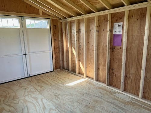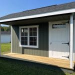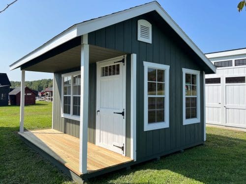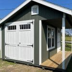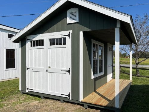 Features: 40″ x 14′ Porch, 3′ Single Door, (4) 24″ x 48″ Windows, Pressure Treated Floor, Ridge Vent, 3 Transom Windows, 6′ Double Door, Victorian Vents, Posts Painted White, and Ridge Vent