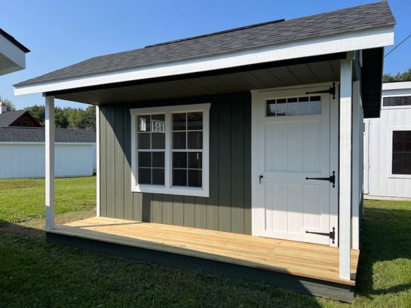 Features: 40″ x 14′ Porch, 3′ Single Door, (4) 24″ x 48″ Windows, Pressure Treated Floor, Ridge Vent, 3 Transom Windows, 6′ Double Door, Victorian Vents, Posts Painted White, and Ridge Vent