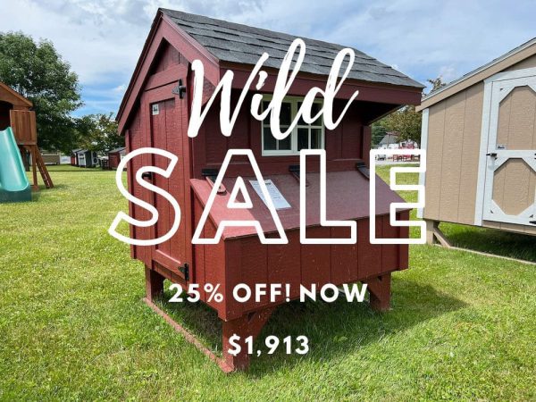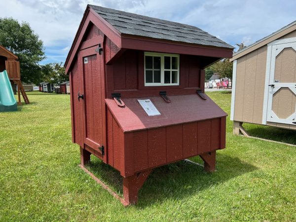 Features: Four Nesting Boxes, Access Door, Window, Lift Top Hatch For Boxes, Chicken Door with ramp, Pressure Treated Floor, Legs and Runners and an Epoxy Floor. Fits 4-8 Chickens