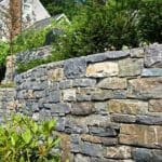 A medium- to coarse-grained weathered granite featuring an array of blues with a mixture of green, black, pink, brown, burgundy, and white with a speckling of red and black garnet inclusions, accented by quartz crystals. Size: 3”-5” x 24”- 48” 44-58 sq ft 2,500-3,330 lbs per pallet