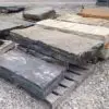 A medium- to coarse-grained weathered granite featuring an array of blues with a mixture of green, black, pink, brown, burgundy, and white with a speckling of red and black garnet inclusions, accented by quartz crystals. Price $415 each – 4′-5′ x 16″-24″ x 6″.