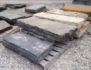 A medium- to coarse-grained weathered granite featuring an array of blues with a mixture of green, black, pink, brown, burgundy, and white with a speckling of red and black garnet inclusions, accented by quartz crystals. Price $415 each – 4′-5′ x 16″-24″ x 6″.