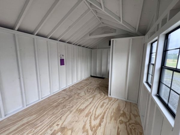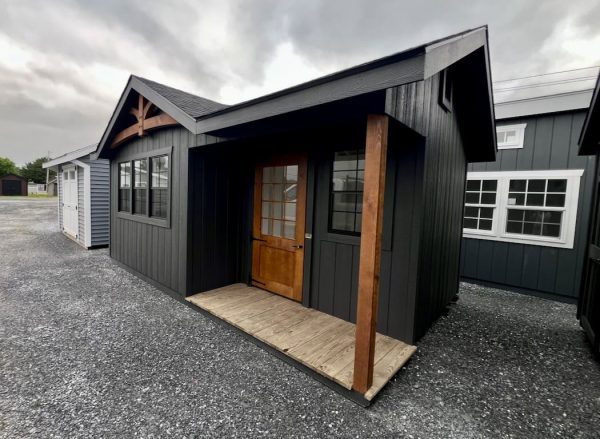 Features: (4) 24″ x 36″ windows, 7′ Sidewalls, Pressure Treated Runners, (2) Victorian Vents, 3′ Single Door, 6′ Double Door, Sash Windows in Doors, 3′ x 8′ Porch with Stained Posts, Peak Dormer, Diamond Plate Thresholds, Paint Interior White, and Timber Frame Accent at Peak
