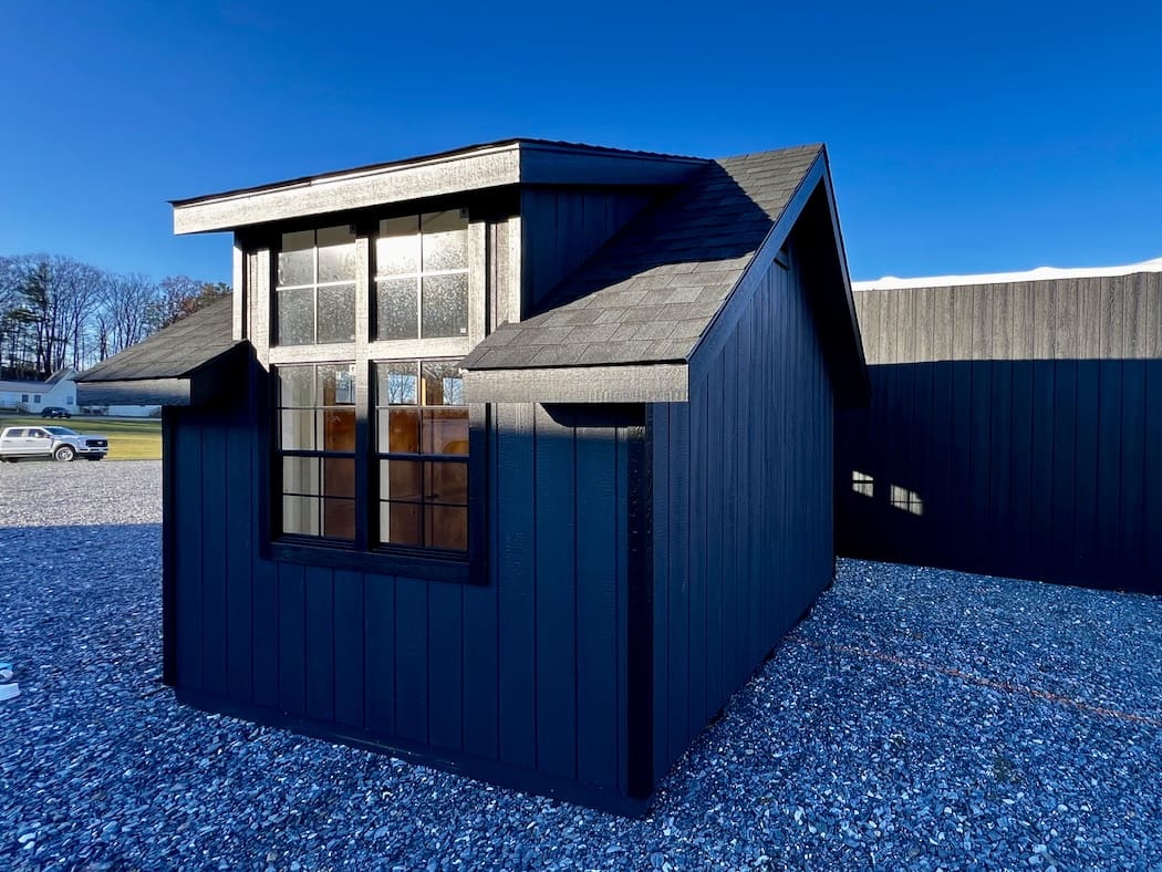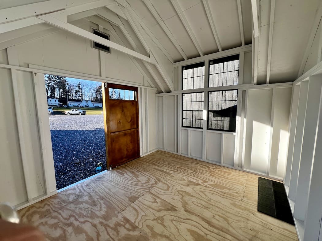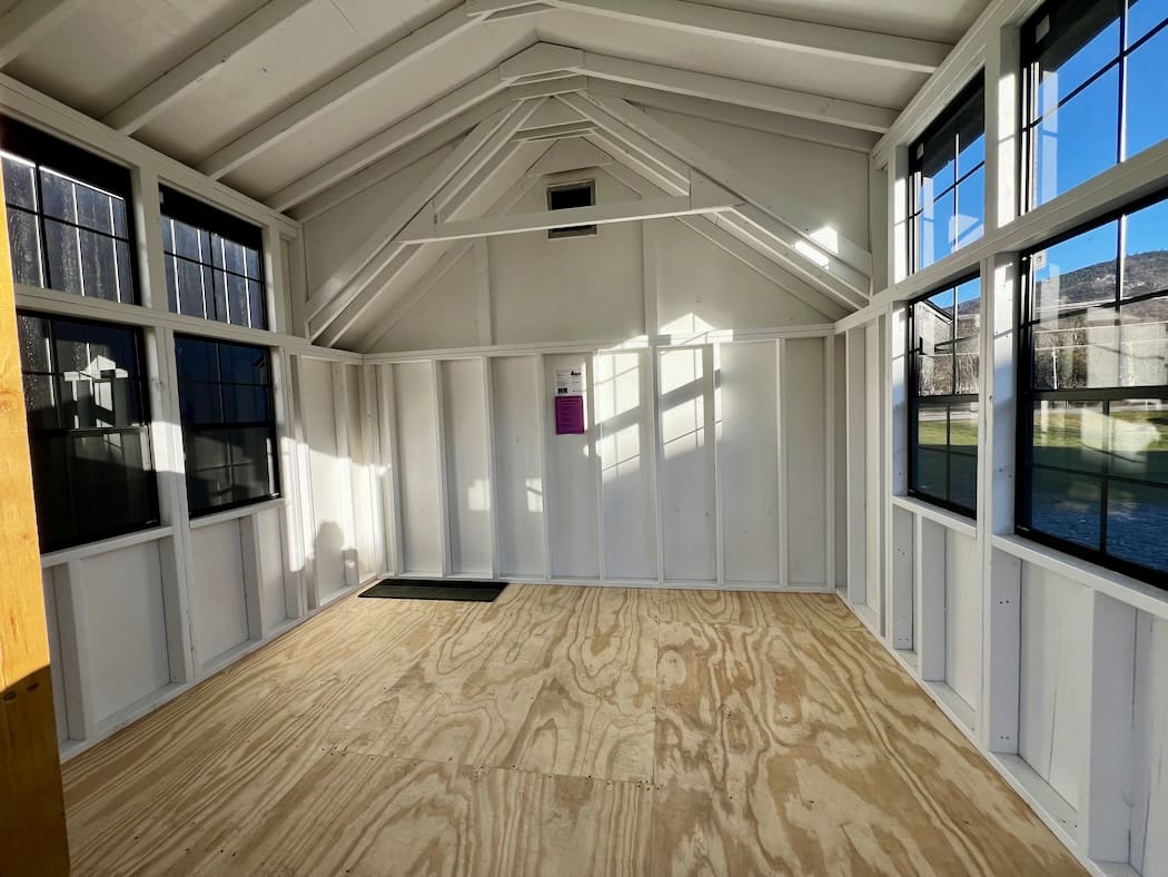 Features: 6′ Sidewalls, (4) 24″ x 36″ Black Windows, Transom Windows in Door, Pressure Treated Runners, (2) Victorian Vents, Double Farmhouse Dormer, Diamond Plate Threshold, Paint Interior White, Timber Frame Straight Accent Truss, and a 6′ Double Door