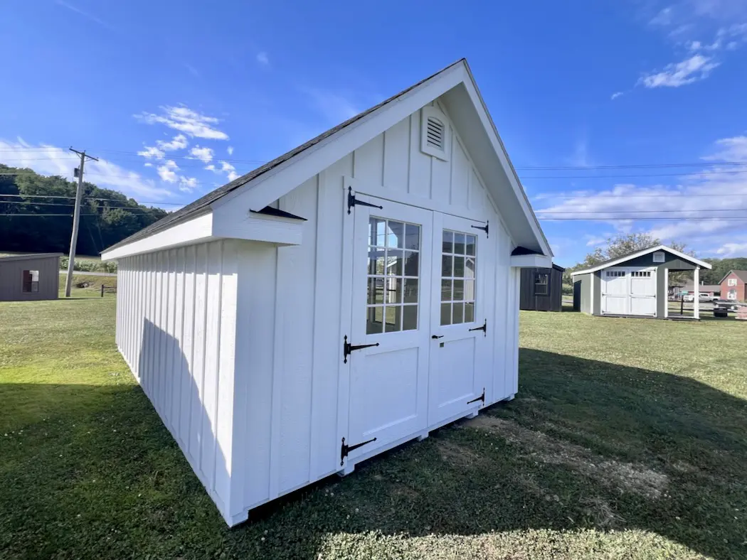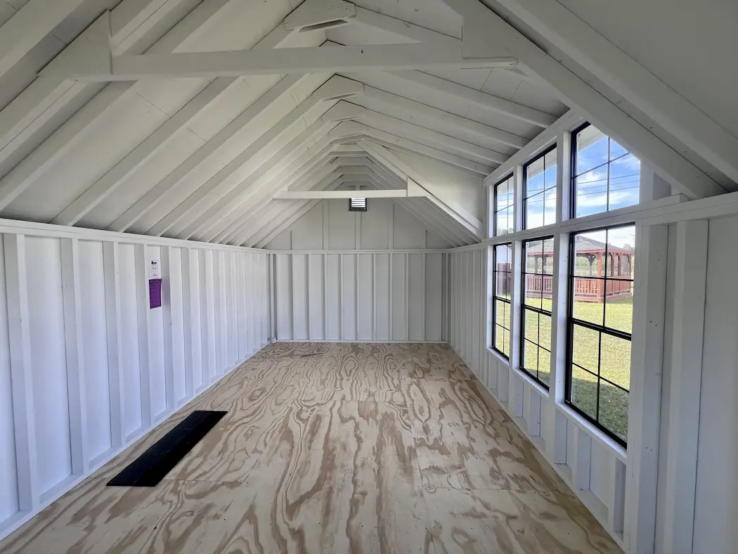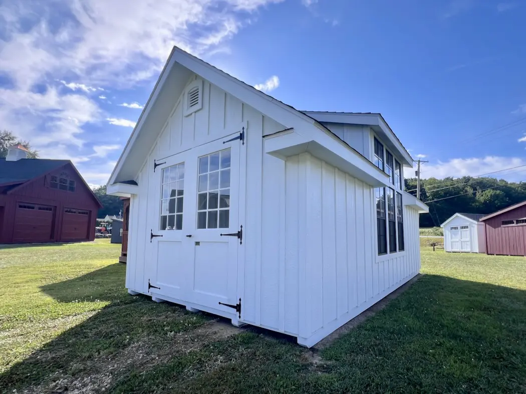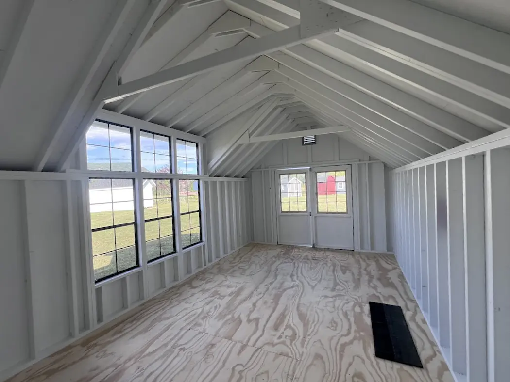 Features: 7′ Sidewalls, (3) 24″ x 48″ Black Windows, Pressure Treated Runners, (2) Victorian Vents, Diamond Plate Threshold, Triple Transom Dormer, Sash Windows in Doors, Paint Interior White, and 6′ Double Door