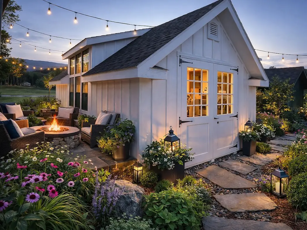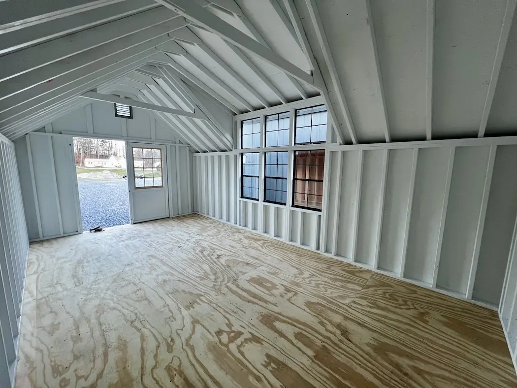 Features: 6′ Sidewalls, (3) 24″ x 36″ Black Windows, Pressure Treated Runners, Triple Farmhouse Dormer, (2) Victorian Vents, Diamond Plate Threshold, 2 Sets of Shingled Boot Returns, Paint Interior White, and a 6′ Double Door with Sash Window